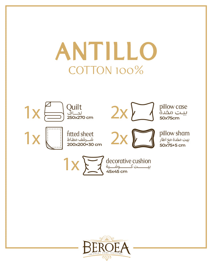 طقم لحاف أنتيللو الإسباني الفاخر مصمم ليمنحك تجربة نوم لا مثيل لها، من خامة الجاكار الفاخرة التي تمنح اللحاف مظهراً ملكياً فاخراً، والقطع الداخلية من القطن لتضمن الراحة والنعومة طوال الليل.