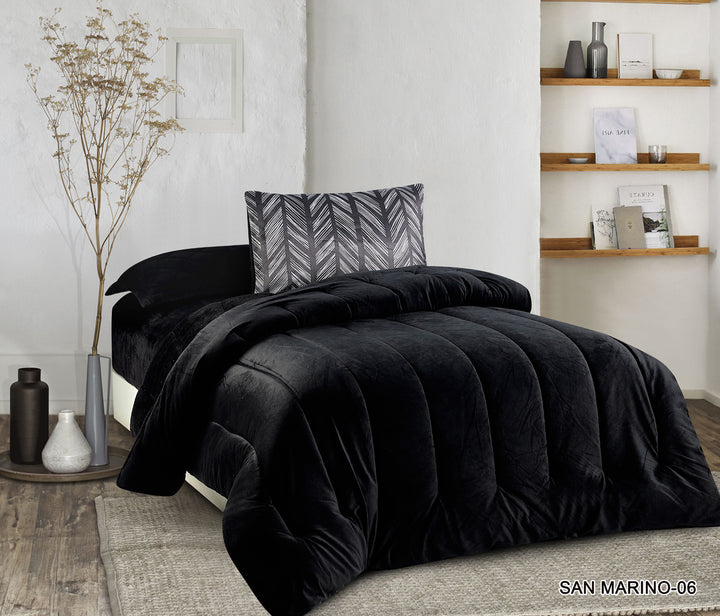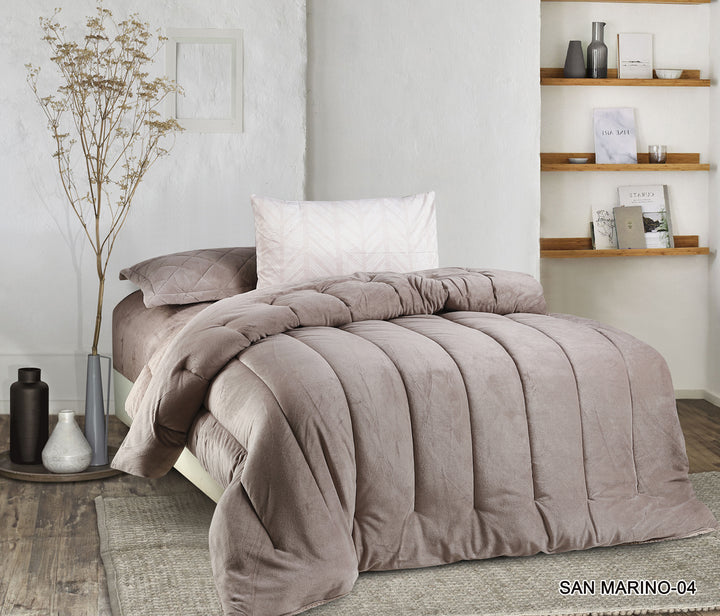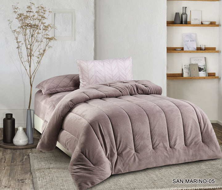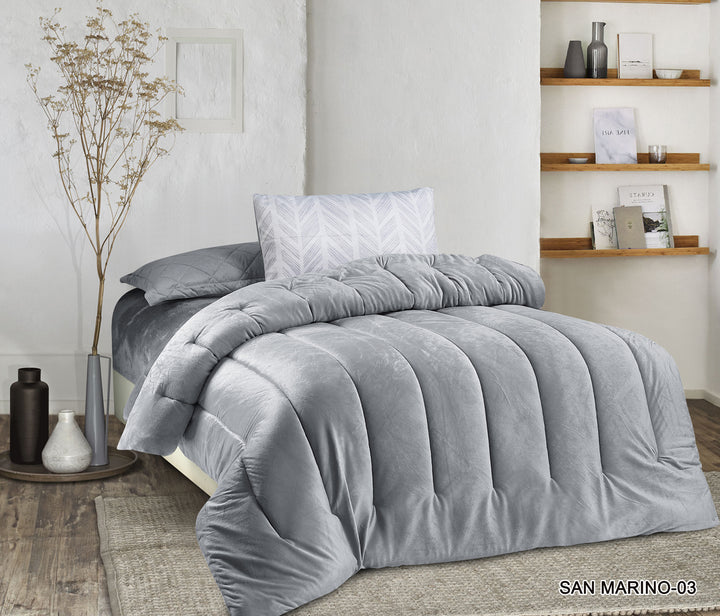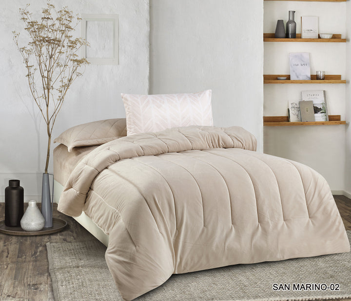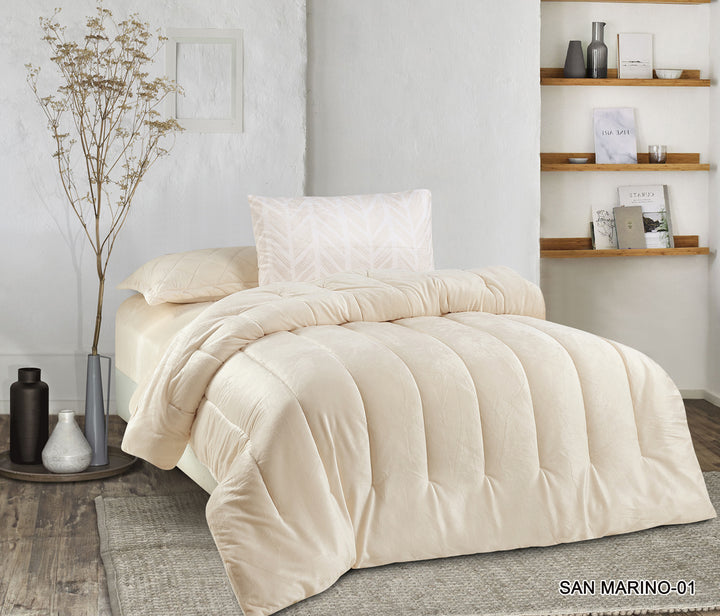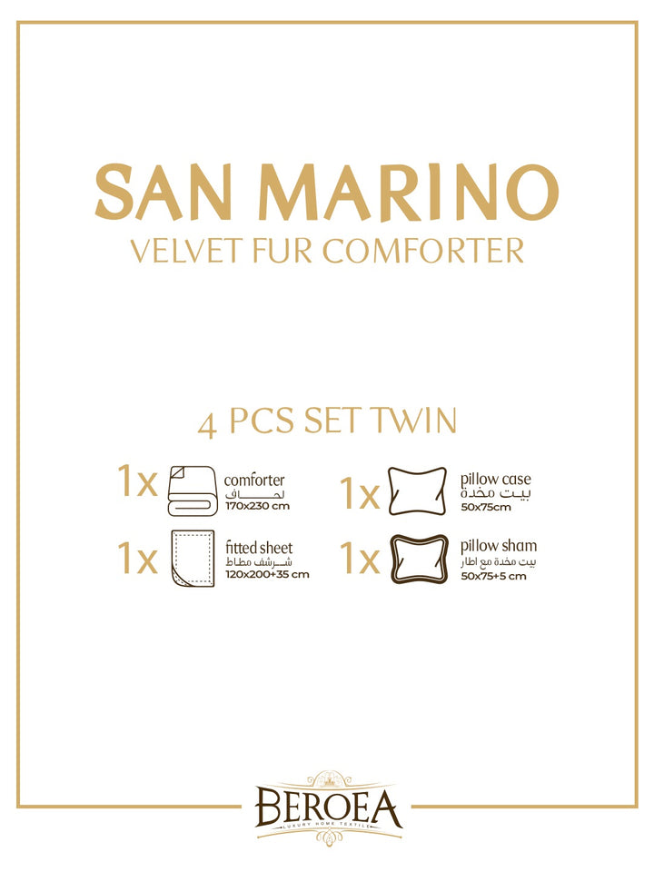 طقم لحاف سان مارينو نسج لإظهار التفاصيل الدقيقة التي يحتويها من الراحة والأناقة. طقم لحاف سان مارينو سيمفونية من الفخامة والأناقة، فتجعل غرفة من نومك واحة ترفة.