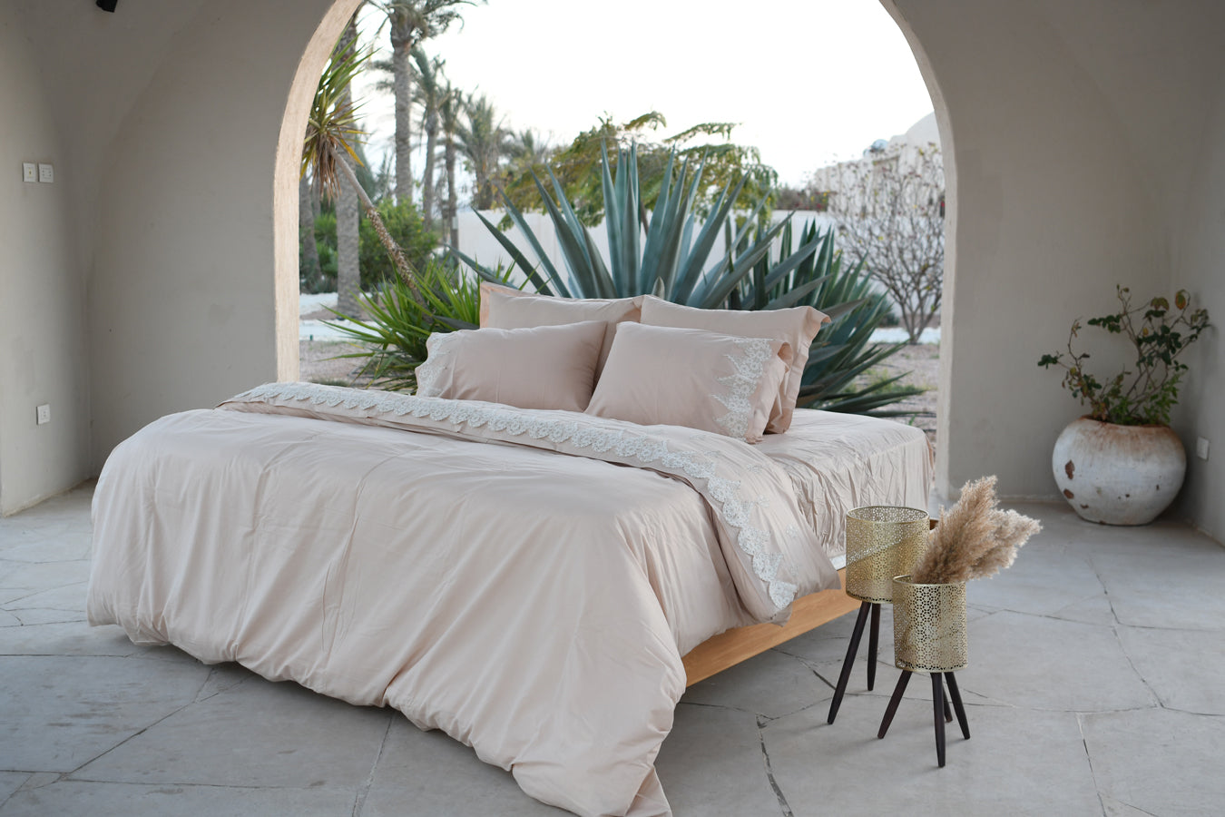 Turkish Destina Duvet Cover setAvailable in its elegant design give your bed a royal look, and keeps it warm thanksto its high quality cotton material.Product Includes: 6 PcsSetMaterial: LaceCotton 100%1...