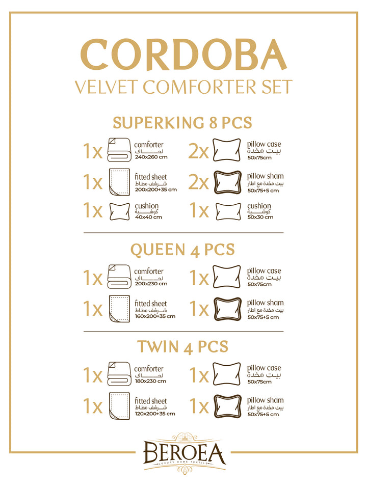 Cordoba is a masterpiece designed for those who seek the pinnacle of indulgence and sophistication, a symphony of comfort and style, providing everything you need for a bed of unparalleled elegance. This set is a statement of refined taste and unparalleled comfort.